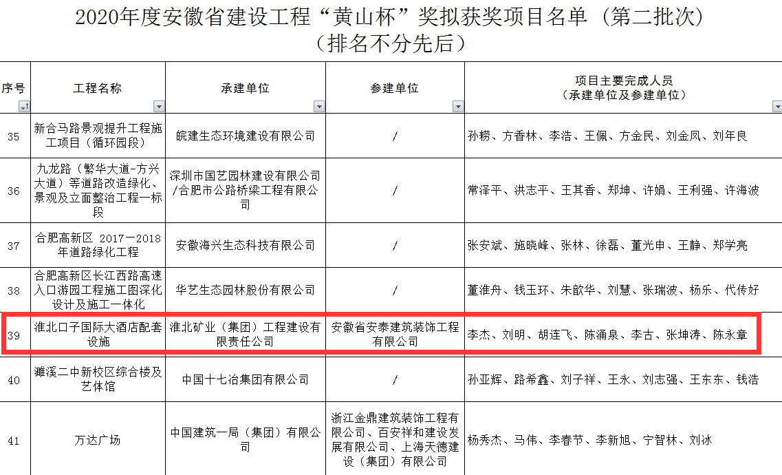 近日,省住房城乡建设厅公布了2020年度安徽省建设工程“黄山杯”获奖项目名单(第二批次),由工程建设公司承建的淮北口子国际大酒店配套设施工程以淮北市申报工程中位列第一的名次荣获该奖项。