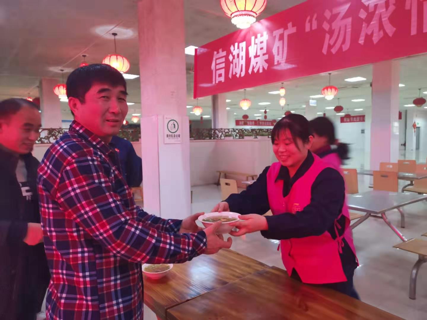 冬至æ¥ä¸´ï¼Œå†³æˆ˜å¹´ç»ˆå·²ç»åˆ°æœ€åŽå†²åˆºé˜¶æ®µï¼Œ12æœ�21日晚ä¸�11ç‚¹ï¼Œä¿¡æ¹–çŸ¿é£Ÿå ‚ç¯ç«é€šæ˜Žã€çƒç«æœå¤©ï¼ŒçŸ¿å·¥ä¼šåœ¨è¿™é‡Œå¼€å±•â€œæ±¤æµ“æƒ…æµ“æš–å¿ƒé—´â€æ´»åŠ¨ï¼Œä¸ºä¸€çº¿èŒå·¥é€ä¸Šçƒæ°”腾腾的鸡汤,为决战年终ä¿å®‰å…¨é¼“åŠ²åŠ æ²¹ã€‚åœ¨å¯’å†·çš„å†¬æ—¥é‡Œï¼Œé¸¡æ±¤çš„é¦™å‘³å’Œè¯¥çŸ¿é¢†å¯¼çš„æ…°é—®ã€ç¥ç¦äº¤ç»‡åœ¨ä¸€èµ·ï¼Œç»™é»˜é»˜è€•耘在基层一线的èŒå·¥å¸¦æ¥ä¸ä¸æš–æ„。èŒå·¥çº·çº·è¡¨ç¤ºï¼Œåœ¨å¹´æœ«å²åˆæ›´è¦å‘æ‰¬å®žå¹²ç²¾ç¥žï¼Œå…¨åŠ›ä»¥èµ´ï¼Œæœ‰åŠ›ã€æœ‰åºæŽ¨è¿›å„项工作,确ä¿å¹´åº•的安全生产,为推动矿打赢“ä¿å®‰å…¨ã€æ”¶å¥½å®˜ã€å¼€å¥½å±€â€æ”»åšæˆ˜è´¡çŒ®è‡ªå·±çš„åŠ›é‡ã€�