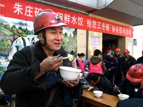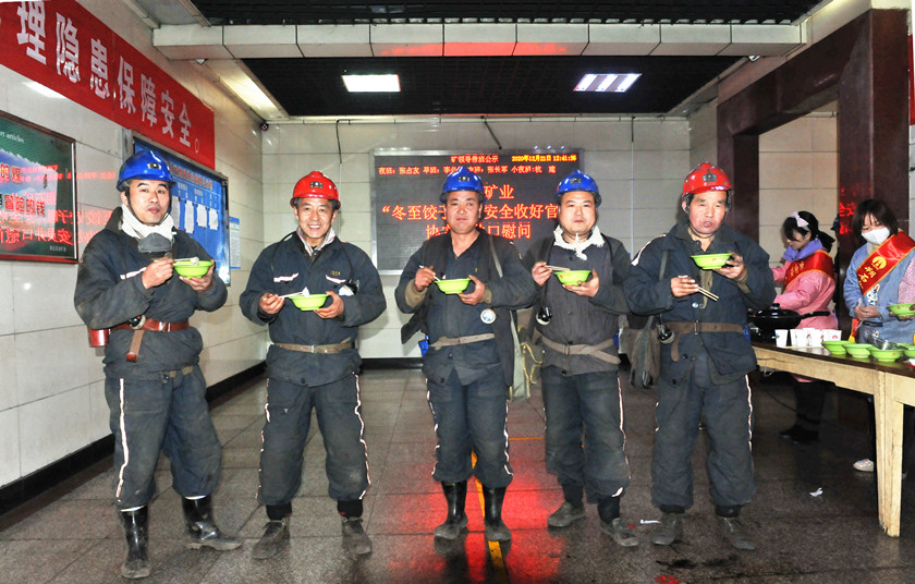 “师傅,åƒç¢—饺åå†ä¸‹äº•å§ï¼äº•ä¸‹å·¥ä½œä¸€å®šè¦æŒ‰ç« æ“作,注æ„安全啊ï¼â€â€œå„ä½å¸ˆå‚…ï¼Œä½ ä»¬åˆšä¸Šäº•å§ï¼Œè¾›è‹¦åŠ³ç´¯äº†ï¼Œæ¥ï¼Œåƒç¢—水饺暖暖身压压饿解解ä¹ã€‚â€å†¬è‡³ä¹‹æ—¥ï¼Œæœ”石矿业井å£å¤„处充满温暖和è°çš„æ°›å›´ï¼Œä¸Šä¸‹äº•的一线èŒå·¥ç«¯ç€å¥³å·¥å安员递过æ¥çš„çƒæ°”腾腾的水饺,åƒåœ¨å˜´é‡Œï¼Œæš–在心里ã€�
