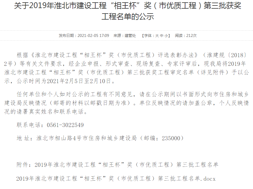 日前,淮北市住房和城乡建设局公布了2019年淮北市建设工程“相王杯”奖(市优质工程)获奖工程公示名单,由工程建设公司承建的淮北矿业股份有限公司临涣选煤厂西区新增精煤仓工程、桓湖花园(南侧地块)10#-19#及2#地下车库、安徽口子酒业股份有限公司退城进区搬迁项目 1#—5#制曲大楼等三项工程同时在列,成为获奖数量最多的施工单位。