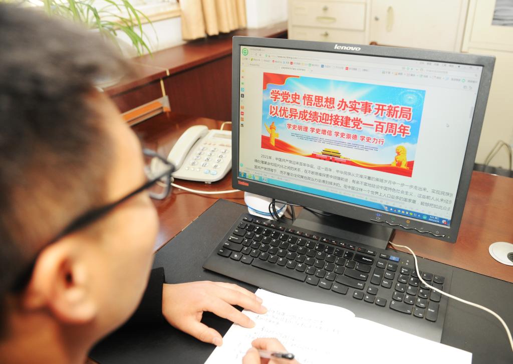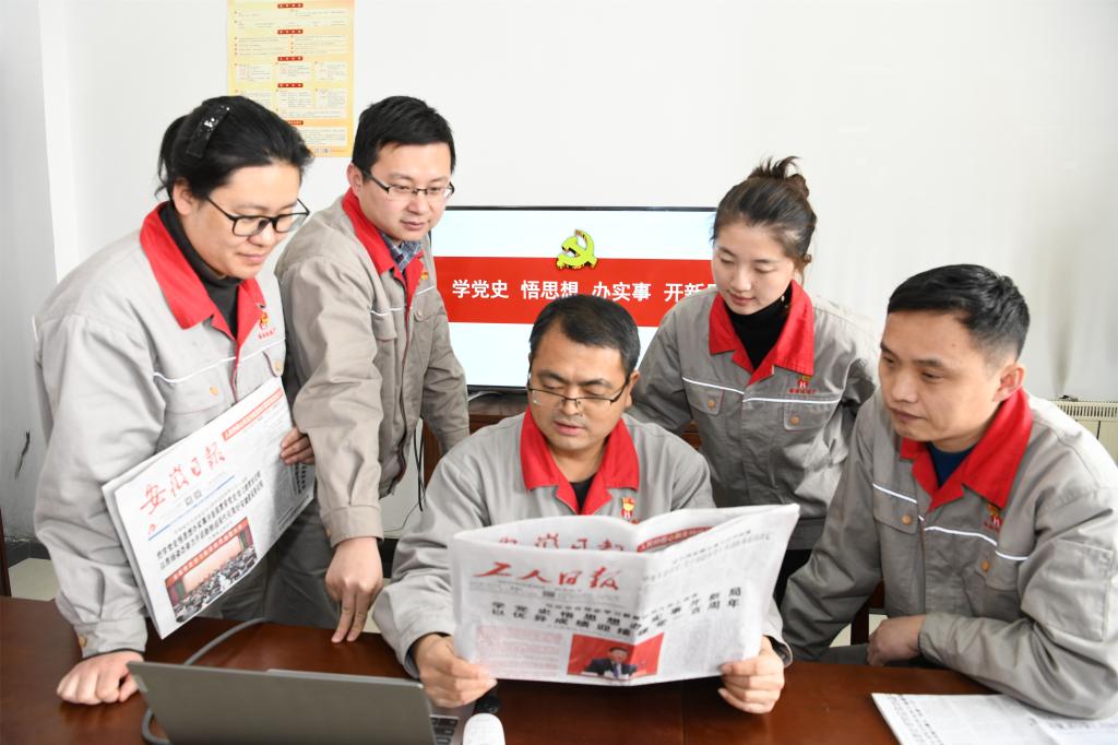 党史学习教育开展以来,临选厂党委把党史学习教育与党员干部本职岗位工作有机对接起来,互相融合,做到“两手抓、两不误、两促进”,增强党史学习教育的针对性和实效性,推动党史学习教育高质量开展。图为该厂党员干部正在利用工作之余学党史、谈感悟。