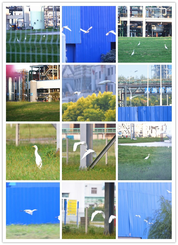 在初秋湛蓝的天空中,它们成群结队,时而在管廊桥架上空盘旋,时而拍翅降落在绿化带上。它们扑扇着翅膀奔跑在水塘边的浅水里,把雪白的身影映在清澈的水面上。它们迈着长腿走在刚刚修剪过的草丛中,悠然自得,向人们展现自己独特的姿态,抑或昂头挺胸提起一只脚,用另一只脚站立张望马路上过往的车辆与行人。看样子,它们已经把这里当作休憩、生活的乐园。