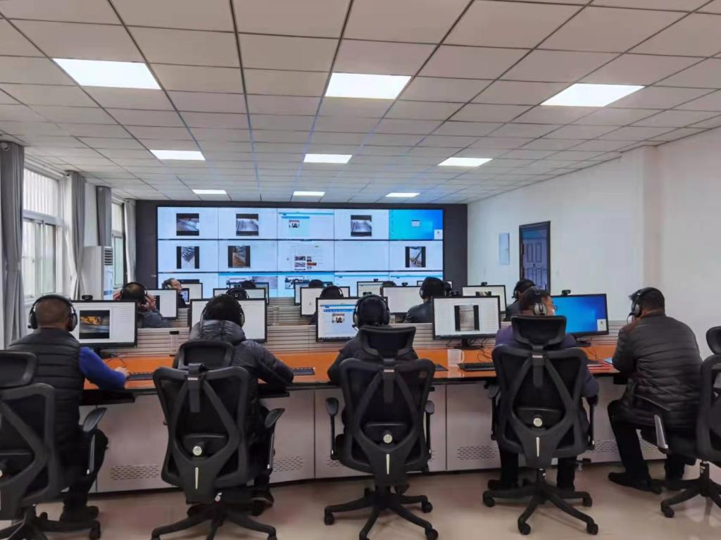 物流园区视频验收集控中心大屏滚动,验收员盯屏幕,戴耳麦,开话筒,态度认真。这里,正在开启2022年物资分公司物资管理验收新系统建设的新跨越。