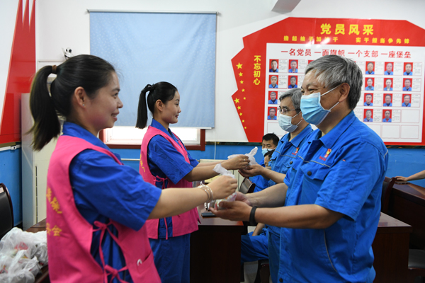 “师傅,请您吃个粽子,上班一定要注意安全!�6�2日,淮选厂工会组织协安员开展“粽香飘万里 端午话安全”协安慰问活动,助力“安全生产月”期间安全、稳定有序生产,筑牢亲情防线�