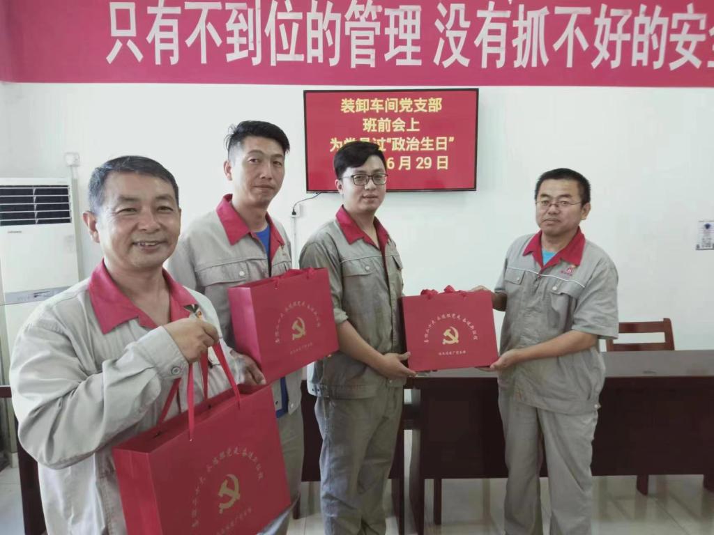 为庆ç¥ä¸å›½å…±äº§å…šå»ºå…š101周年ï¼�6æœ�29日早晨,在临涣选煤厂装å¸è½¦é—´ç”Ÿäº§å››ççå‰ä¼šä¸Šï¼Œæ”¯éƒ¨ä¹¦è®°ç»™å½“ççš„3å党员一个大大的“惊喜â€ï¼Œåœ¨å…¨çèŒå·¥ç¾¤ä¼—çš„è§è¯ä¸‹ï¼Œä¸ºå…šå‘˜ä»¬è¿‡â€œæ”¿æ²»ç”Ÿæ—¥â€ï¼Œåœ¨ä¸ºä»–们é€ä¸Šç”Ÿæ—¥ç¤¼ç‰©å’Œè´ºå¡çš„åŒæ—¶ï¼Œä¹Ÿè¡¨è¾¾äº†æ”¯éƒ¨å¯¹ä»–们的关心关爱。(撰稿 :肖éœ� å®¡æ ¸ï¼šåˆ˜å°çŸ¿ï¼�