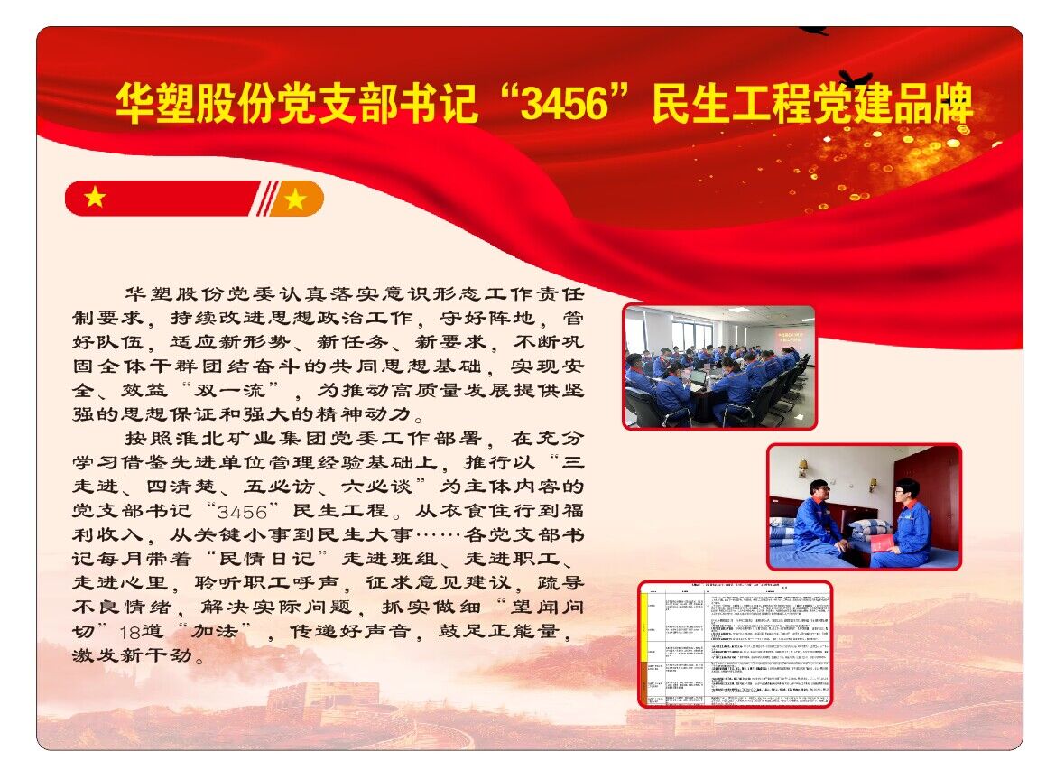 党委工作部署,在充分学习借鉴先进单位经验基础上,推行了以“三走进、四清楚、五必访、六必谈”为主体内容的党支部书记“3456”民生工程。从衣食住行到福利收入,从关键小事到民生大事,各单位党支部书记每月带着“民情日记”走进班组、走进职工、走进心里,聆听职工呼声,征求意见建议,疏导不良情绪,解决实际问题,抓实做细“望闻问切”18道“加法”,鼓足正能量,激发新干劲。