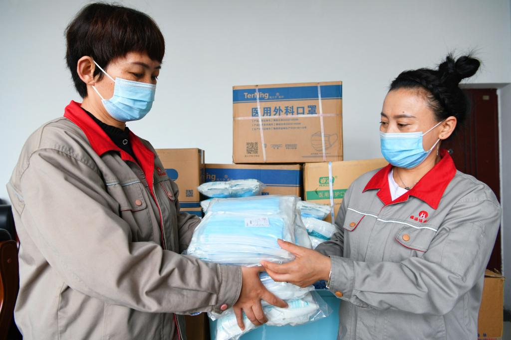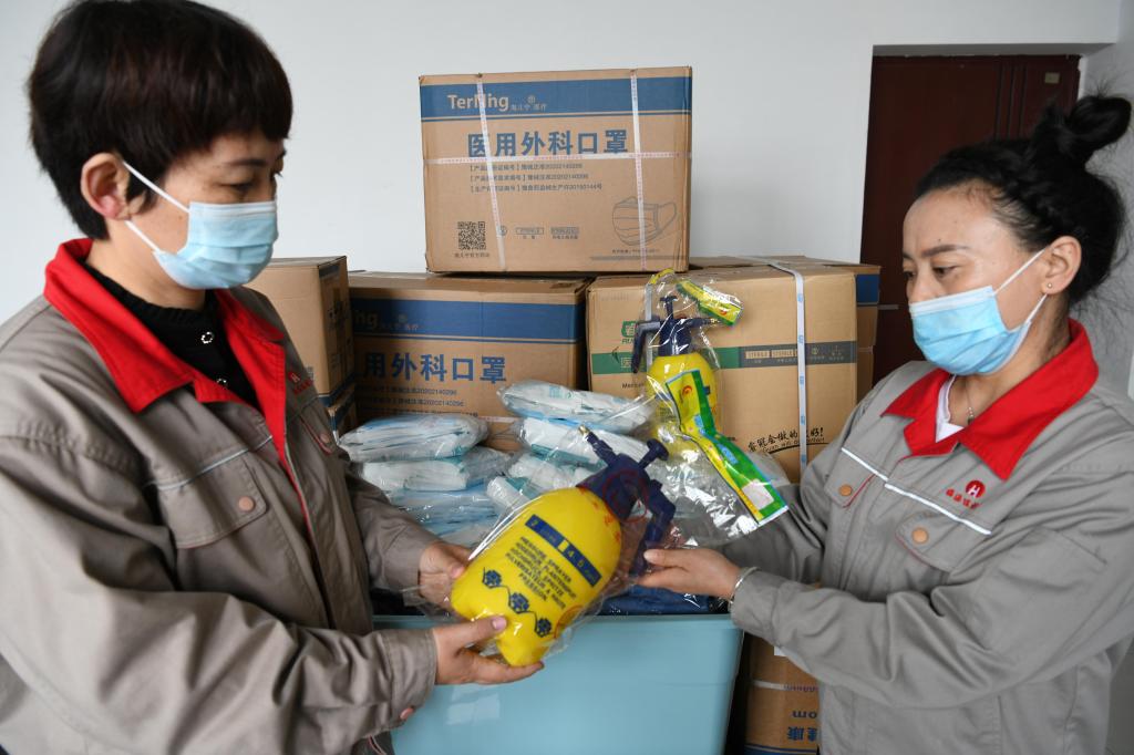 面对当前严峻复杂的疫情防控形势,临涣选煤厂打好主动仗,全面做好防疫物资和生活物资保供,确保疫情防控和安全生产两不误。图为11月11日,工作人员为职工发放口罩、酒精喷壶等防疫物资。