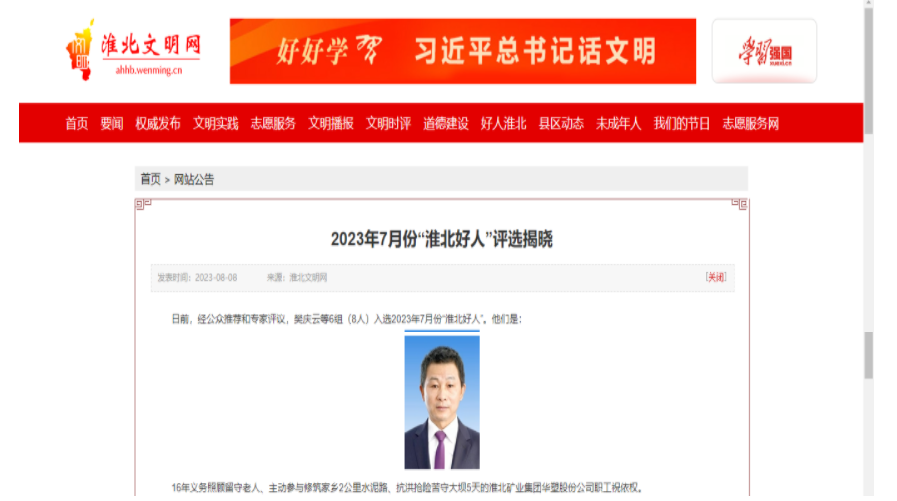 近日,安徽华塑股份有限公司无为华塑矿业职工祝依权被淮北市文明办评为2023年7月份“淮北好人”。这是该公司继刘晓铭获评“安徽工匠”,王署获评安徽省“最美军嫂”“最美家庭”后精神文明建设取得的又一成果。