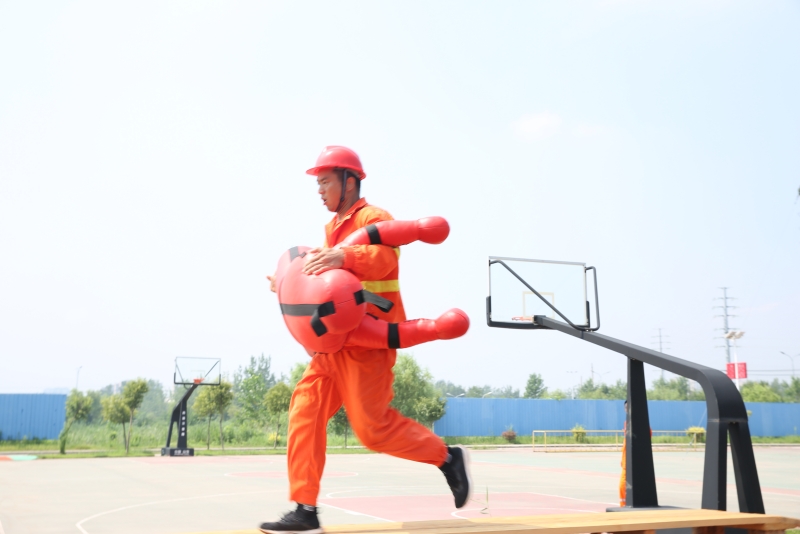 “5分10秒,无扣分项”,这是比武队集训1个月,队内测试“600米综合技能”项目时交出的成绩单。该项目包含爬绳、剪切、矮巷、坡道运送伤员、曲桥、翻轮胎、抛重物、佩戴呼吸器跑、锯木料9种课目,是检验救护队员在一定强度的体能消耗下,完成单兵技能操作的能力,并综合考查速度、爆发力、耐力、柔韧性、协调性及装备使用熟练程度等个人素质的综合项目。