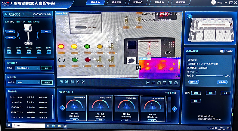 U230c智能机器人系统以轨道式巡检机器人为核心,由软件系统、轨道系统、供电通讯系统,机器人本体、分布式感知组件及其它相关设备组成,集移动视频巡检、红外测温、环境测控、分布式感知、数据智能分析等功能为一体,可在操作室设置系统服务器,实现对高压配电室巡检区域设备的实时监控、数据分析管理存储检索等功能,在对高压配电室高压开关柜进行自上而下全面巡检的同时,其仪器舱内集成多种检测传感器,对高配室的开关柜和供电环境条件进行综合检测,包括视觉分析、红外热成像检测等。投入使用后,可提高供电系统的巡检频率和巡检质量,提升关键区域的智能化运维水平,实现配电室无人、少人值守。