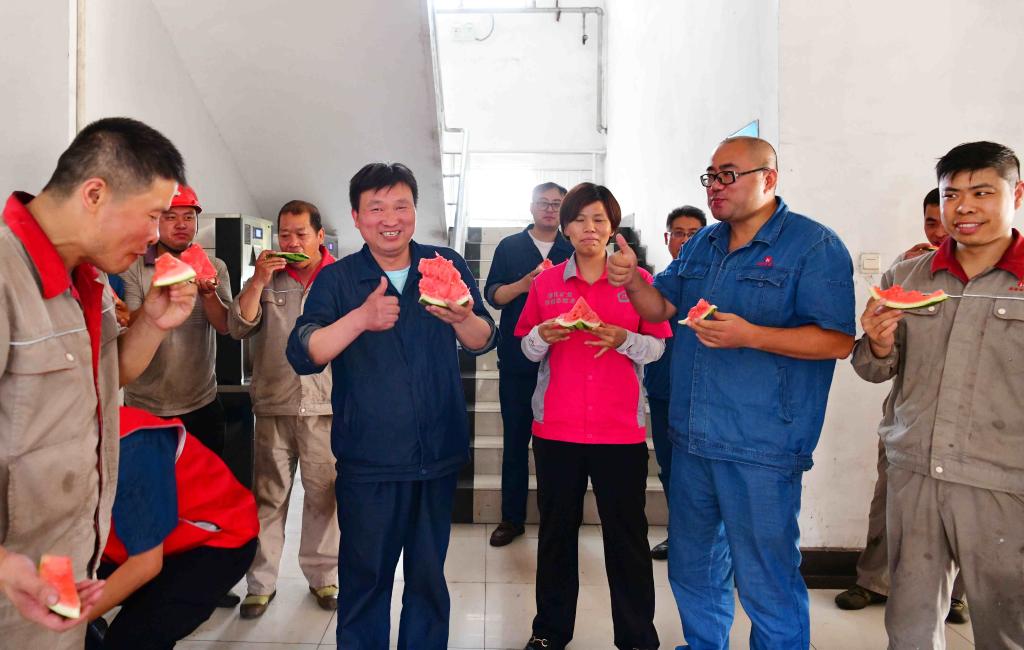 该厂将采购的6000斤新鲜西瓜第一时间送到生产一线车间、班组和职工的手上,确保夏季职工的身心健康,实现安全生产。“这瓜又大又甜,感谢厂里给我们送西瓜、送清凉!”“吃在嘴里、甜在心里,感觉浑身都凉爽,工作起来也特别带劲!”大家不时竖起拇指夸赞着,喜悦之情溢于脸上。(撰稿:石启元 审核:杜燕)