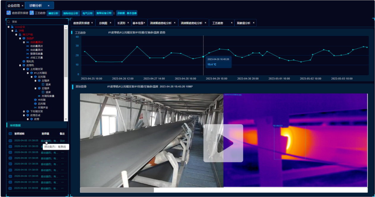 该厂原煤、精煤皮带运输机通过智能巡检机器人动态巡检、定点视频实时监测、振温在线监测、皮带纵撕专项监测多位一体,形成振温、视频、图像、热像、声音、气体等多元化监测。50+AI算法模型部署,部件级故障智能报警,全故障诊断分析,完成周期性皮带状态巡检、关键部位24小时监测、异常及时识别和远程状态掌控,并通过多种采集设备内部的边缘智能算法,进行异常状态联动控制,可实时监测托辊异常、皮带跑偏、皮带撕裂、筒皮变形等关键问题,真正实现无人化巡检。