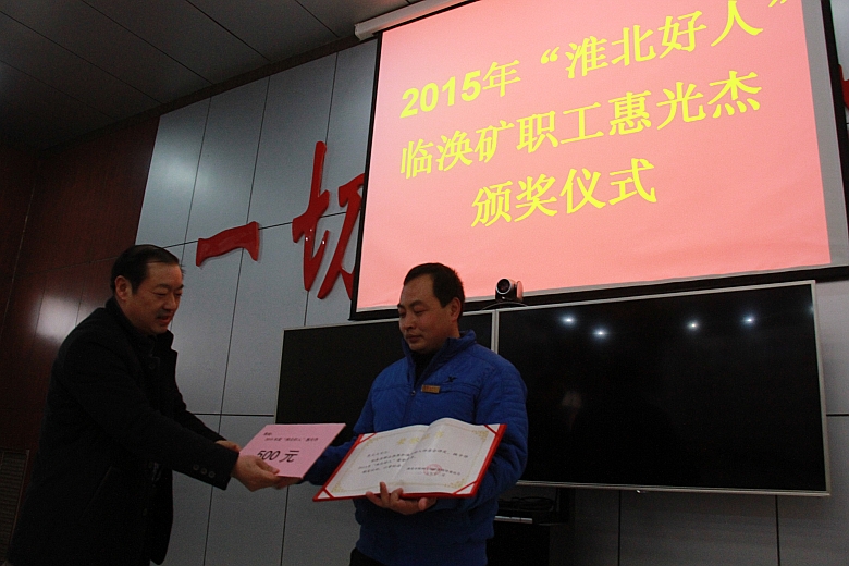 2月29日下午,临涣矿在安全生产信息中心会议室举行颁奖仪式,为荣获2015年度“淮北好人”称号的修护一区职工惠光杰颁发荣誉证书和奖金。