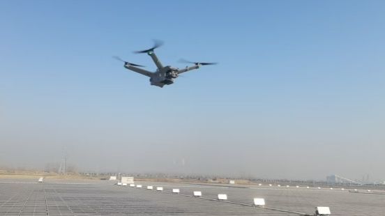 “起落架安装到位,飞行器展开,机臂已锁紧,云台相机安装完成,飞行电池电量充足并装入,无人机自检及连接工作已完成,开始起飞!”这是电力分公司值班人员在对袁一84MW水面光伏一巡检时做的“规定”动作。