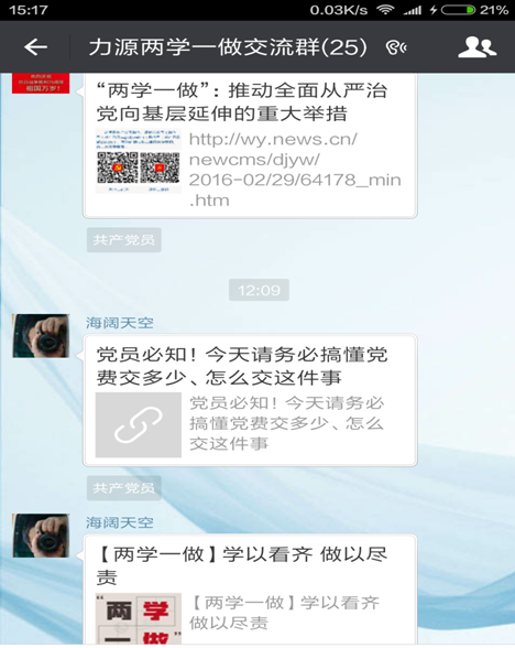 为开展好此次活动,该党支部建立“两学一做”微信群,将每位党员凝聚在内,同时订阅公众号“共产党员”、“安徽先锋网”,利用这个微信平台推送学习计划及内容,将党的基本理论知识和中央、及上级党委下发的相关文件资料传递给广大党员,让大家及时学习;同时,大家通过这个平台,交流学习心得,提高了学习质量。