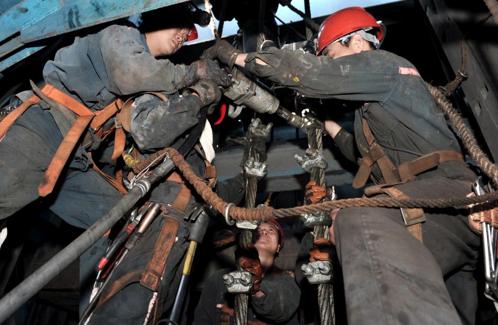 为保证矿井的安全、持续、稳定发展,祁南矿从6月9日到13日,展开停产检修工作。该矿此次停产检修项目主要是更换副井提升钢丝绳、罐笼和副井下口中罐托罐器缓冲装置。图为检修职工正在进行新旧绳对卡作业。