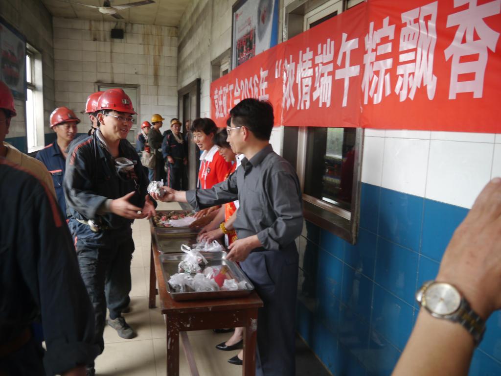 在传统节日端午节到来之际,该矿工会主席许肖峰、副主席刘怀芹和部分女工委员、协安员手捧“爱心粽子”,在当日中午12:00早早在井口等候即将升入井的矿工们。
