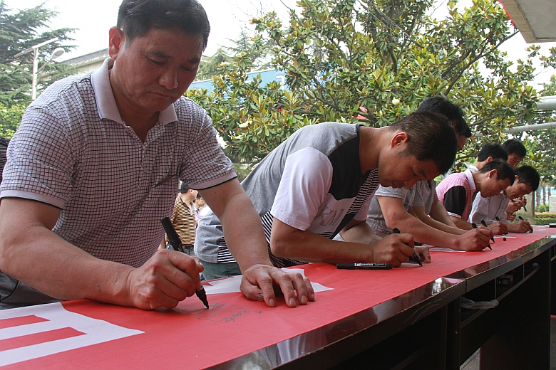 张宗标、张友根与全体人员一起在印有“强化安全发展观念,提升全民安全素质”安全生产月主题内容的大红条幅上郑重签名。