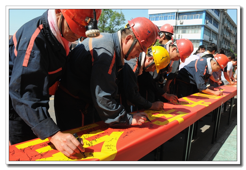 最后,该矿干部职工在印有“安全压倒一切、一切为安全让路”的横幅上,郑重的签下了自己的安全承诺。
