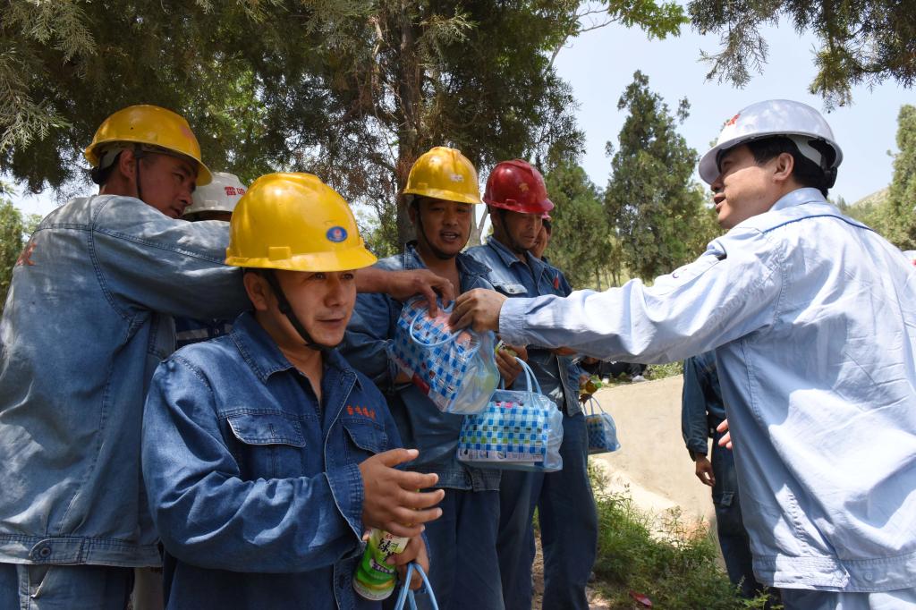 6月29日,雷鸣科化公司工会主席张春玉(右)正在为职工师傅们发送绿茶等饮用品。当日,淮北地区室外温度高达34度,骄阳似火,酷暑难耐。公司工会准备了清凉解暑用品,送到烈日下野外爆破作业的一线职工手中,让职工师傅们倍感丝丝凉意。