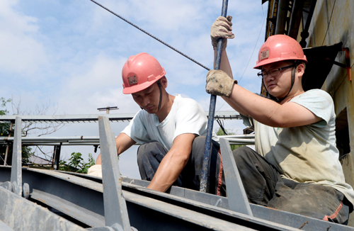 图(2)朱仙庄矿2名职工在对改造排矸系统进行运输安装。