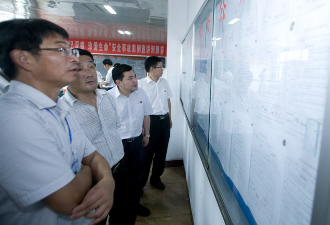 7月27日下午,省国资委组宣处调研员刘宪辉一行,冒着高温,在集团公司党委副书记袁兆杰和相关处室领导陪同下来到杨庄矿,走车间、下基层,检查督导该矿“两学一做”学习教育工作。矿长李遵明,矿党委书记李庆军,党委副书记、纪委书记杨德良等领导陪同检查。