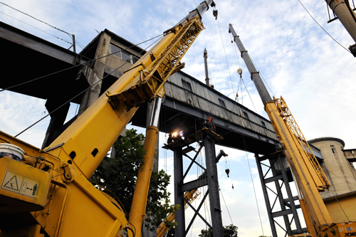 为消除这一隐患,淮北矿业决定,对朱仙庄矿地面201皮带机栈桥中段进行加固。该工程由工程建设公司安拓项目部负责施工,为不影响矿井正常生产,加固采取在栈桥下加装钢结构钢梁的方式进行。主梁采用两根(800X300)mm“H”型钢,重量18吨,长度30米,固定在两个高度为18米和14米的钢结构支架上。