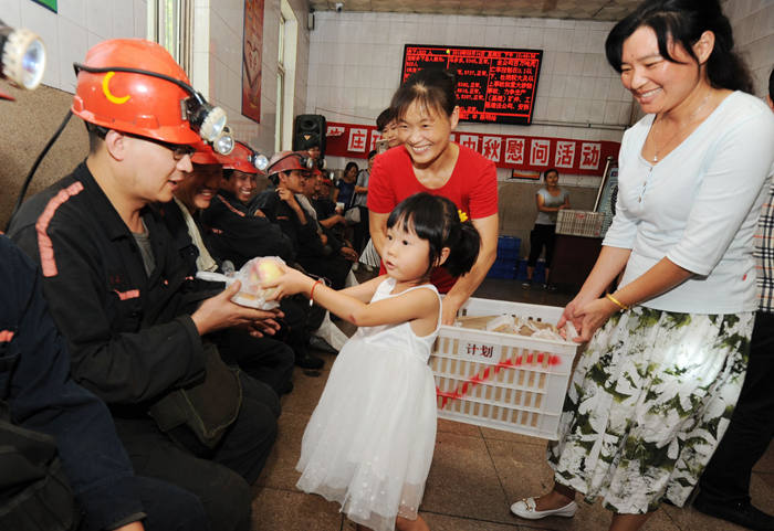 9月14日中午,一声声“叔叔,下井注意安全”“大大,中秋快乐”稚嫩、软儒的童声在朱庄矿井口候罐室响起,朱庄矿工会女工部在此开展中秋节慰问服务活动。该矿女工部认真筹划,邀请职工家属向一线职工发出安全倡议,安排小朋友为在节日期间仍坚守在工作岗位的矿工师傅送去了节日的问候和安全的嘱托,同时克服资金困难,购买月饼、苹果、花生奶等慰问物品,让他们感受到节日的氛围,牢记安全的嘱托。