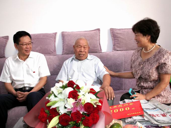 值九九重阳佳节来临之际,淮北市人大常委会原副主任、市慈善协会会长杜文灵,市总工会副主席孙秋玲一行来到杨庄矿,在杨庄矿长李遵明的陪同下慰问全国劳模马典周。