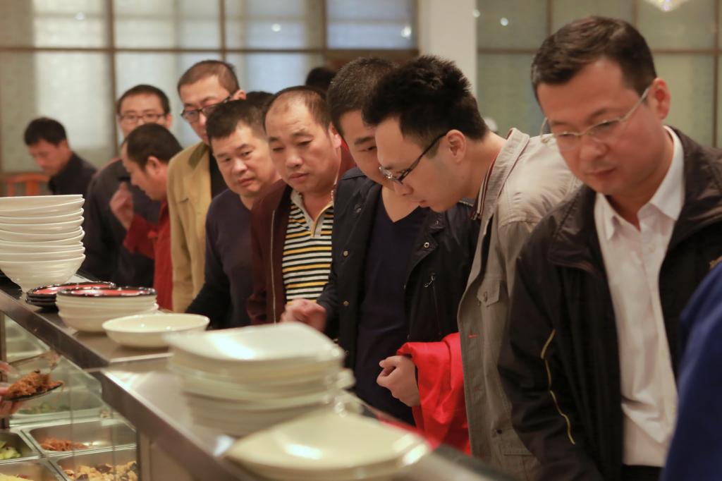 10月10日中午,涡北矿职工餐厅二楼自选厅内人头攒动,就餐人员尽然有序地排队挑选心仪的饭菜。