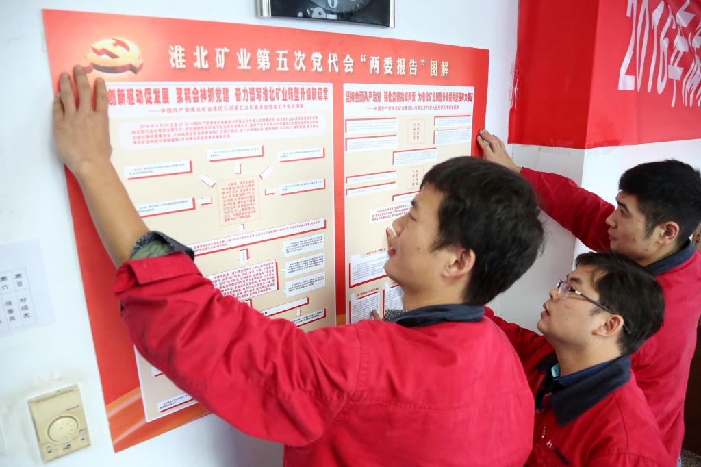 涡北矿紧紧围绕“两委报告”,通过牌板展、《党代会之声》广播专题栏目、有奖征文、党代会精神宣讲进科区等活动,全方位、多层次宣传、贯彻淮北矿业第五次党代会精神,进一步激发广大干群干事创业的热情。图为10月25日,综采二区职工张贴矿统一制作的“两委工作报告”图解。(责编:徐成贵)