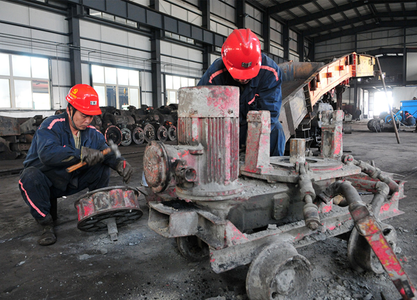 袁店二矿全面深化内部市场化运作,变“发工资”为“挣工资”,以经济杠杆激发全员创效的积极性,增强企业降本增效、健康发展的内生动力。图为该矿机厂职工在维修喷浆机。