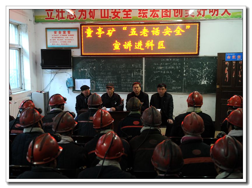 12月9日,周五安全例会时间,童亭矿关工委组织开展了“五老”话安全安全宣教下基层活动。“五老”宣讲团分别来到采、掘等单位,为一线职工送去关爱和安全嘱托。在宣讲中,矿关工老同志结合我矿“百日安全会战”活动,结合实际,对以往发生的各类事故案例进行剖析, 教育引导广大干部职工深刻吸取事故教训,坚决遵章守纪,杜绝“三违”,用实际行动全力打好“百日安全会战”攻坚战,确保矿井安全生产稳定发展。
