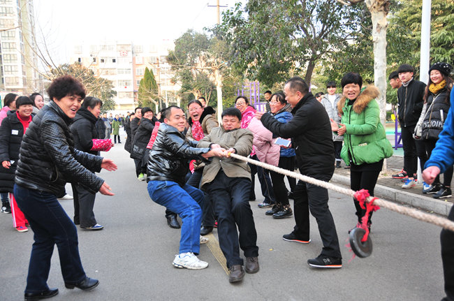 12月28日下午,安徽淮北煤电技师学院一名女职工在行进的队列中向大家招手致意。当天下午,该学院体育运动场笑语欢声、气氛热烈,学院工会组织全院教职工开展了“大步向前”和“拔河比赛”两项文体活动。在辞旧迎新之际,让紧张忙碌了一年的教职工得以欢聚交流、放松心情,同时藉此进一步增强团结、互助和竞争意识,以饱满的热情迎接新一年的工作。