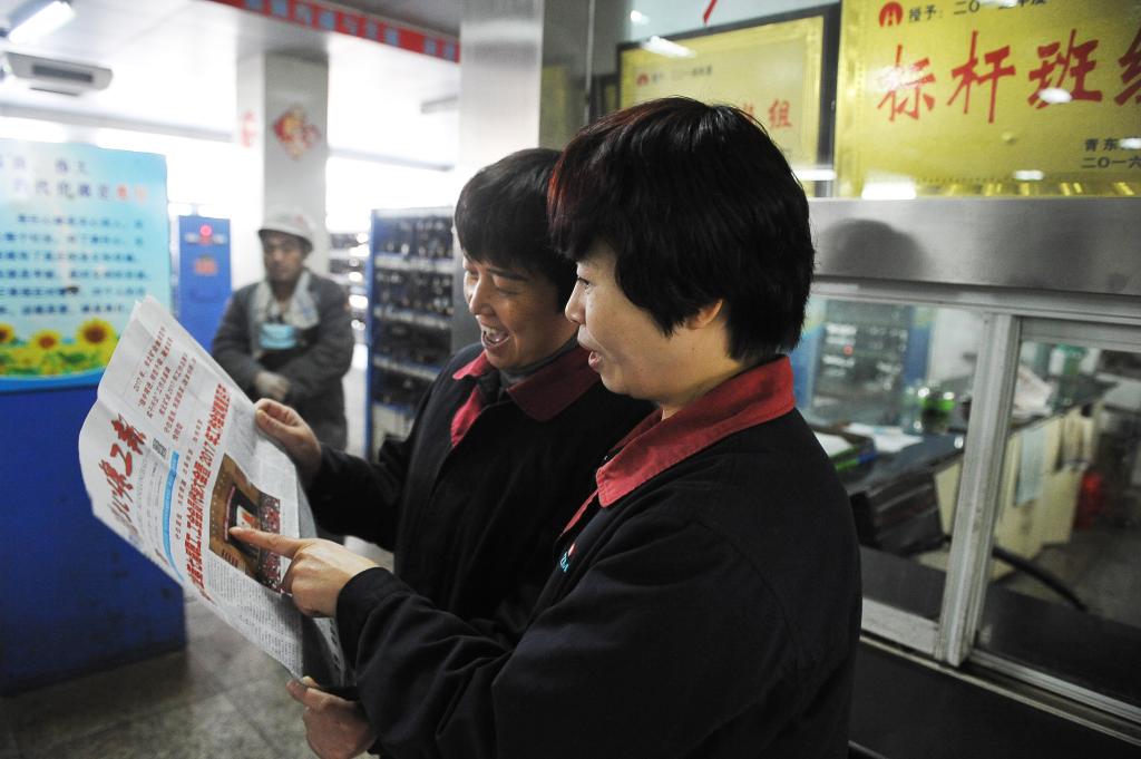 淮北矿业“两会”召开后,青东煤业组织干部职工通过电视、网站、报纸等形式,第一时间学习会议精神,明确2017年工作目标任务,让广大职工对企业未来的发展充满期待和憧憬,干群士气空前高涨。图为该公司机电科灯房班女工通过《淮北矿工报》关注“两会”召开盛况。