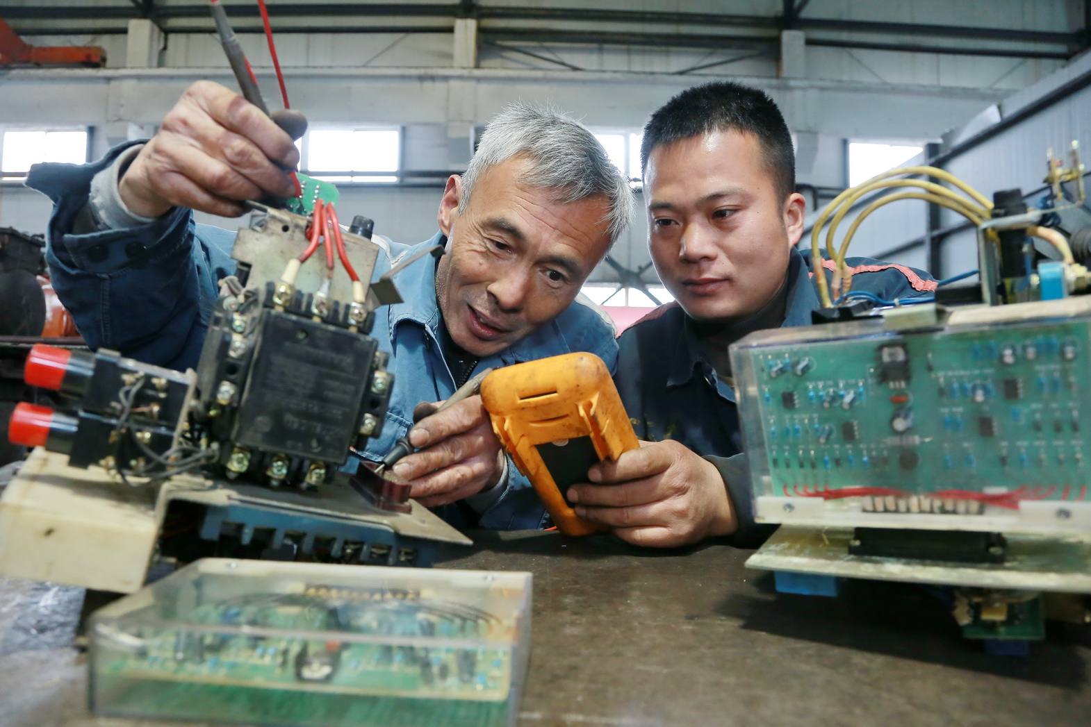 涡北矿把培养一专多能的技术型职工作为当前职工教育培训工作的重中之重来抓,通过大力开展“师带徒”和“岗位练兵”等活动,为矿井的安全科学发展储备人才动力。图为3月13日,机电科电修车间技术“大拿”李月庭(左)为青工纵小刚传授电器开关维修技巧。