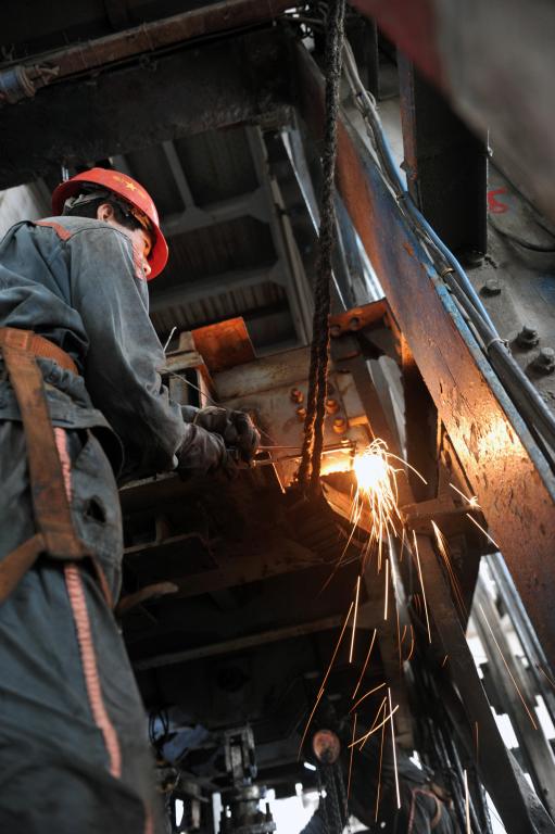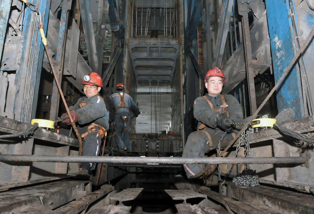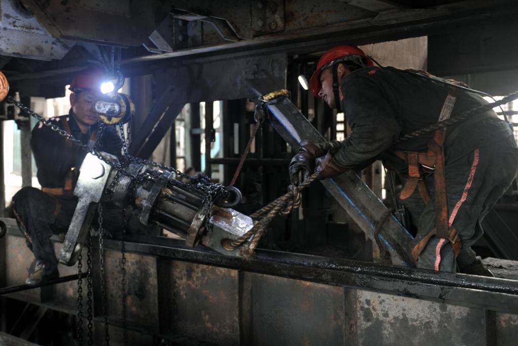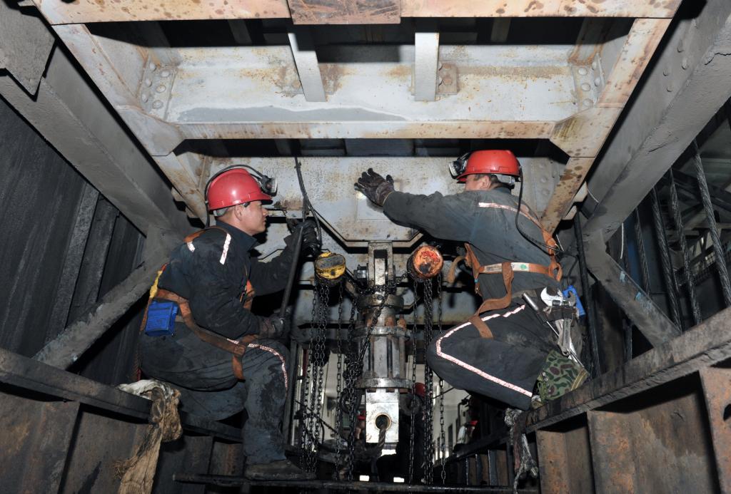 上图为祁南矿职工对“尾绳旋转器”进行安装。