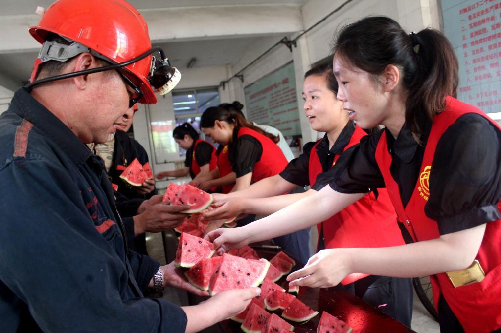 连日高温,为做好防暑降温,保障员工身体健康,传递公司对员工的关心,6月1日中午,杨柳煤业协安员带着西瓜来到副井口开展“酷暑送清凉,关怀暖人心”活动,为一线员工送去清凉和工会“娘家人”的关怀。