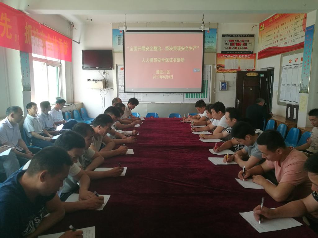安全,是幸福的保障;安全,情系着每位职工的家庭;安全,是工作中不可忽视的前提。图为祁南矿掘进二区按照安全生产月“全面开展安全整治,坚决实现安全生产”活动部署,利用安全例会时间集体撰写安全保证书。