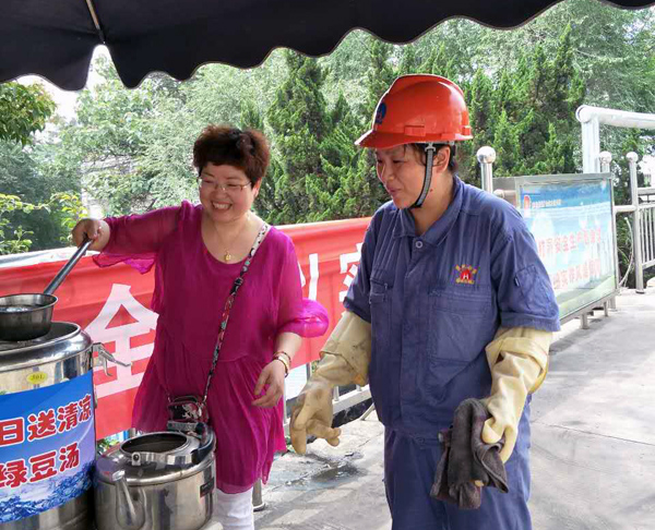 一顶清新的凉棚,一套整洁的桌椅,一块温馨的问候牌板,再加上两桶热气腾腾的绿豆汤,赫然出现在通往生产岗位附近的大路上。日前,淮北选煤厂专门针对连续高温湿热天气开展了配送绿豆汤“夏日送清凉”活动。