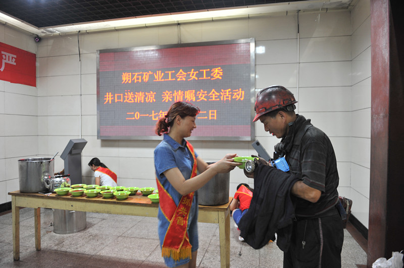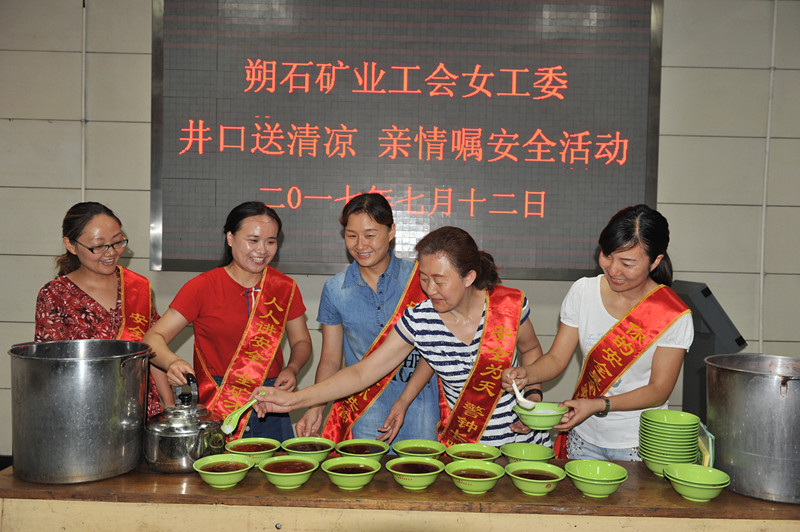 7月12日,是农历入伏第一天,淮北气温高达35°,许多人都躲进阴凉地和空调屋里避暑了,而朔石公司女工委却组织女工协安员们抬着一桶桶精心熬制的绿豆汤,拿着白糖、碗勺,中午冒着高温奔向东部井井口,慰问上下班的职工,同时不忘对他们进行亲情安全叮嘱。