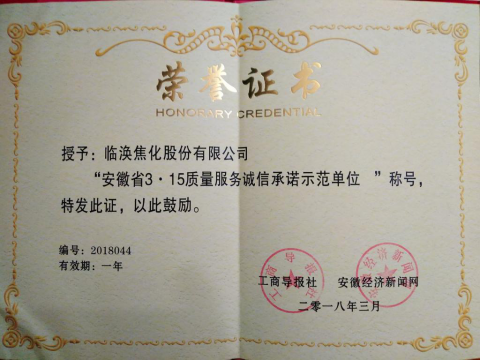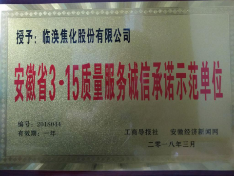 近日,安徽省2018年“3·15质量服务诚信示范单位”评选活动顺利落下帷幕,临涣焦化公司通过层层审核,成功获得“安徽省3.15质量和服务诚信承诺”这一荣誉称号。