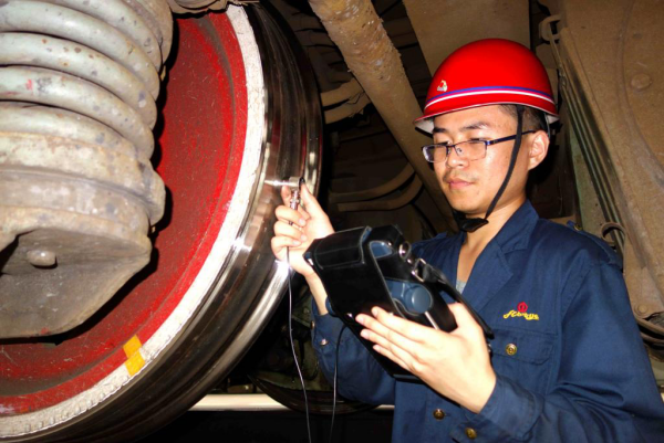 “轮对是机车的‘双足’,足健方能日行千里”,铁运处应用新设备“CTS-9006数字超声波探伤仪”对机车的轮对踏面和车轴进行探伤,及早发现轮对和车轴存在的裂纹和缺陷,排除安全隐患,确保机车运行安全。图为:临涣机辆段机车探伤员正在车底对轮对踏面进行探伤。