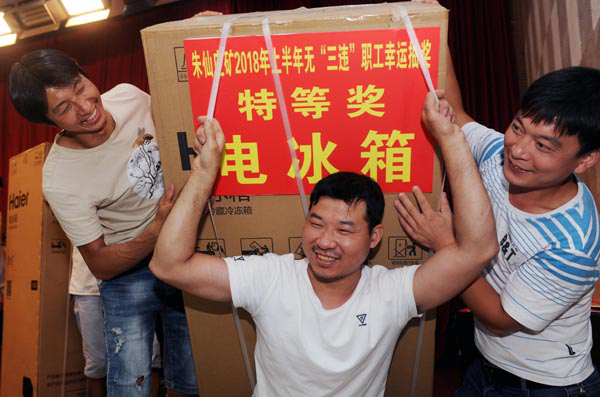 7月26日上午,朱仙庄矿举办2018年上半年无“三违”职工幸运抽奖活动。该矿购买了6台电冰箱、10台洗衣机、20台电风扇、50个电饭煲等奖品,对千名无“三违” 采掘、辅助单位职工进行幸运大抽奖,共有286名幸运职工中奖。激励了矿工们自觉遵章守纪,按章作业,远离“三违”,让安全成为工作习惯。(责编 梁尚文)