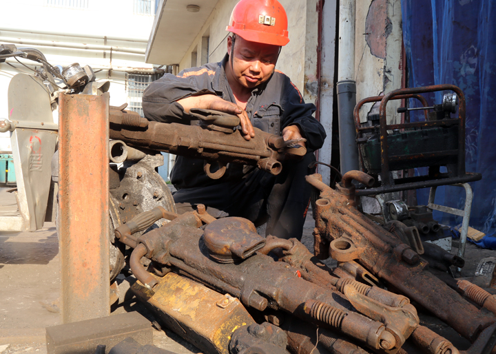 为减少维修成本投入,胡永会繁忙维修之余,就会骑上三轮车满料场的转,到处寻找丢弃的废旧工具及配件。带到工作室后,拆解、筛选、分类……受他的影响,现在各单位都会主动把收集起来的废旧工具,送到维修工作室。在胡永会5月份维修的风镐、风泵、风锯、锚杆机等152台工具中,使用从各类废旧工具上拆下了的配件就占了一半,减少配件投入就多达20000多元。