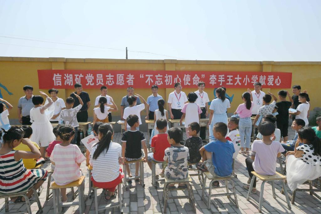 7月1日,在党的第98个生日这一天,信湖矿组织党员志愿者在涡阳县花沟镇王大小学进行关心慰问活动,为该校80余名儿童赠送了“文具大礼包”。